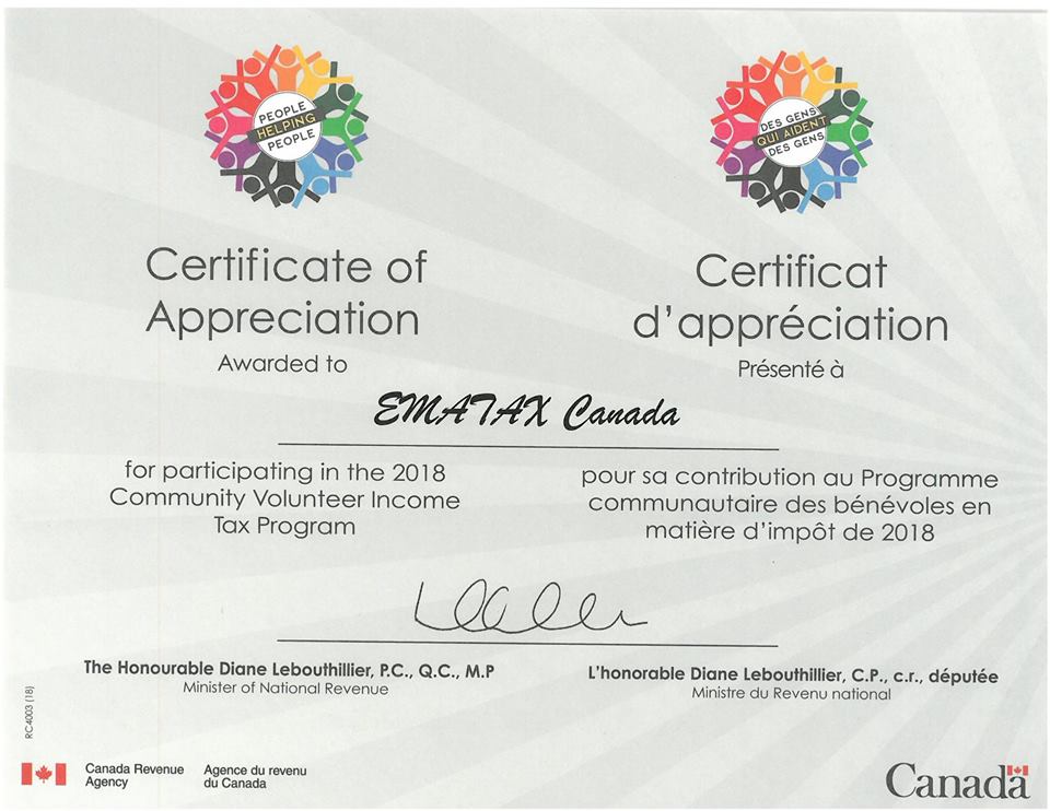 In recognition of EMATAX's Hard work and dedication to the very important CVITP program, we received today Certificate of Appreciation Signed by Minister of National Revenue in Canada. EMATAX CANADA is Proud of Knowing that our participation in the CVITP 2018 has made a real difference in our community.